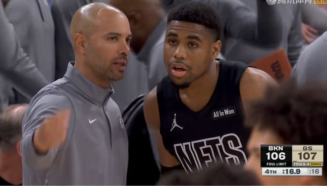 篮网就正常防守,防下这个回合再打进一个就可以追上比分了,他们突然毫无意义的上去,狠狠的对着波尔津吉斯的手来了一巴掌,一掌扇在波神手上白送罚球。这球已经是最后两秒了,你别伸手正常贴防不就行了吗?为什么非要上去狠狠打一巴掌呢?篮网球员得犯规动作都让人看不懂,而且关键是这个球还是篮网球员约翰逊的第6个犯规,犯规结束就罚下了,白送勇士两个罚球反超不说,自己还来个六犯,你这是想赢的意思吗?